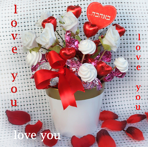 בכלי קרמיקה שפע של פרליני שוקולד טעימים מאד, בשילוב לבבות שוקולד נמסים בפה, שזור עם ורדים וסרטים,ונשיקות מרנג התלהבות מובטחת למי שנאהב