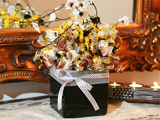 זר מתוק בשחור ולבן שופע פרליני שוקולד בטעמים משובחים,משובצים בסוכריות חמאה נמסות מתנה שמשדרת איכות! לשמח עם מתנה מקורית ומעוצבת, מידות הזר כ 16/27