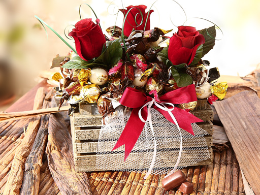 כלי עץ אופנתי עם ורדי קטיפה ושוקולד,זר מתוק השילוב המושלם למתנה מיוחדת, להבעת אהבה, יום נישואים ועוד... מידות הזר כ-35/30