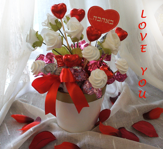 בכלי קרמיקה שפע של פרליני שוקולד טעימים מאד, בשילוב לבבות שוקולד נמסים בפה, שזור עם ורדים וסרטים,ונשיקות מרנג התלהבות מובטחת למי שנאהב