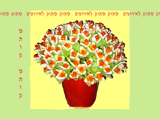 פרחים מתוקים מסוכריות למרכז שולחן, לכנסים, למסיבות רוצים להשאיר טעם מתוק לאורחים שלכם? מגוון אריזות שי ומזכרות עם ממתקים מהשורה הראשונה: לחתונה,ברית/ה,מסיבת רווקות,בר/ת מצווה,ימי הולדת,כנסים,אירועים פרטיים ועוד,בתמונה דוגמאות למבחר המתנות שלנו, ניתן להתאים לכל אירוע את הצבעים,הסרטים ואפילו את סוג הממתק, לנו חשוב כי הארוע שלכם ישאר בלב כולם להרבה זמן המחיר נקבע לפי כמות ההזמנה ואופי המתנה