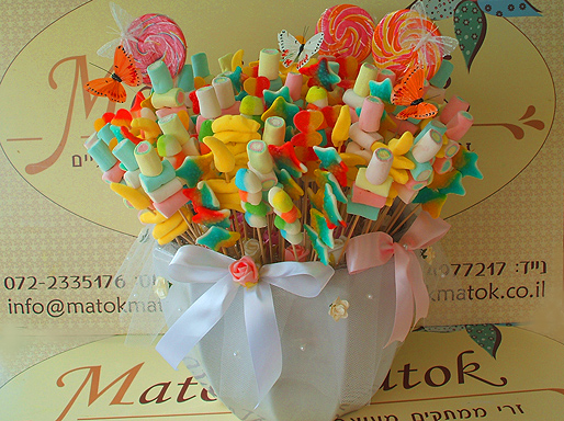 זר ענק של שיפודי סוכריות גומי,מרשמלו, וסוכריות על מקל, מעוצב לארועים גדולים יכול להכיל מאות שיפודי סוכריות גומי מתוקות,,(ניתן לקבל גם בהכשר הבד"ץ) כדי שהארוע שלכם יחרט בלב כולם