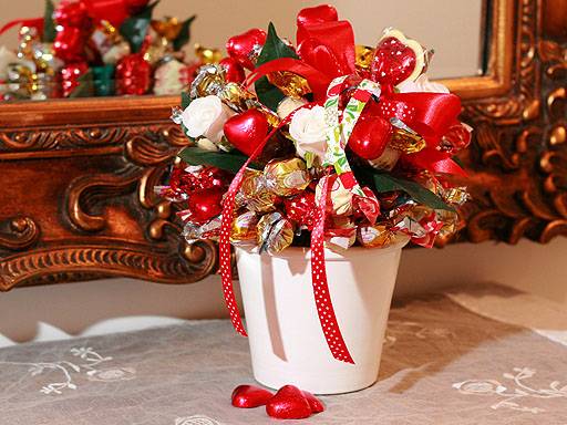 זר מתוק רומנטי להבעת אהבה! מתוק, מעוצב, ומרגש,מכיל פרלינים ולבבות משוקולד מעוטר בפרחים וסרטים אדומים, מתנה מתוקה ומפנקת לימי אהבה! מידות הזר כ 24/22